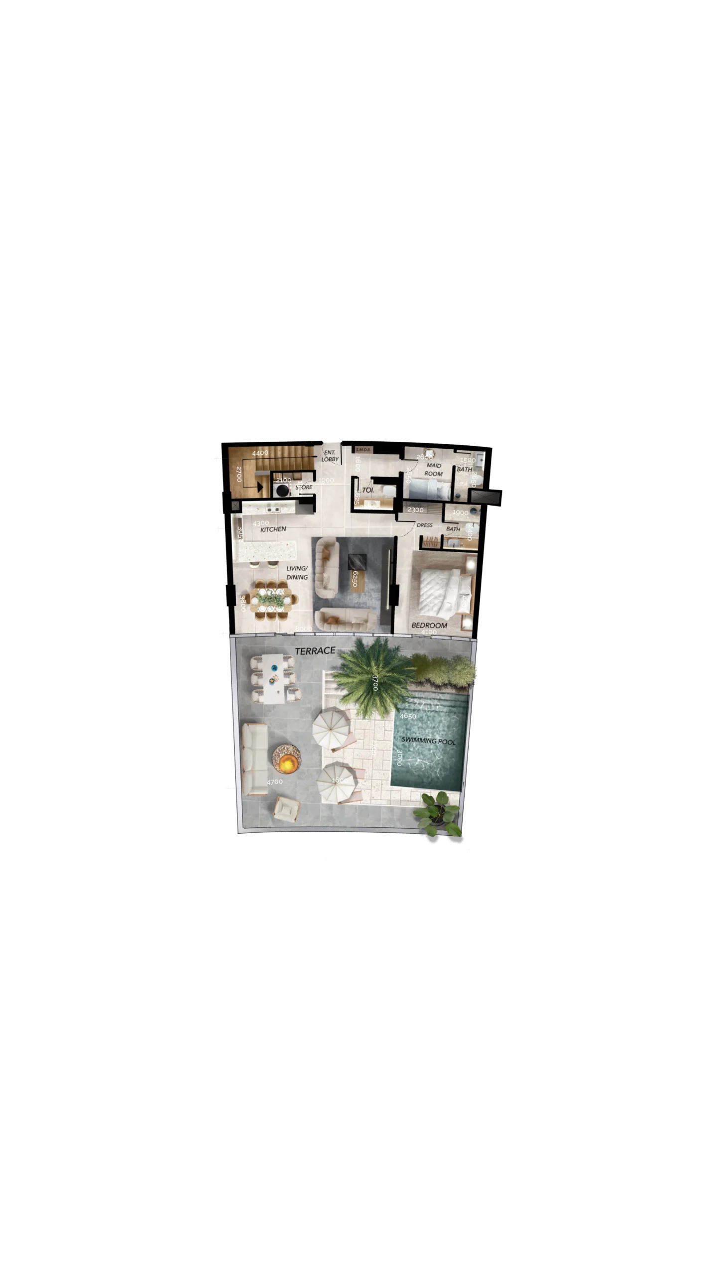 A split-level residence spanning two floors — featuring three bedrooms, a master suite, expansive living and dining areas, a fully fitted kitchen with laundry, three bathrooms, a powder room, a dedicated maid’s room and a pool on the terrace.